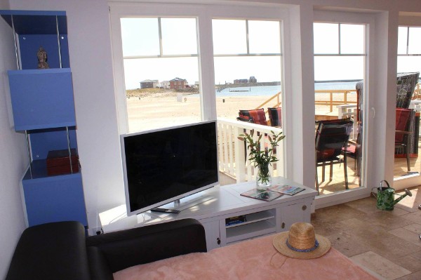 Für eine "Aufbettung" ab 7- Personen (Buchung ab 6 Personen bis 8 Personen) gilt die "8- Personen Ausstattung", mithin die Schaffung einer weiteren Schlafmöglichkeit für maximal zwei Personen im Erdgeschoss durch Ausklappen der Ledercouch, Abbildung unten.