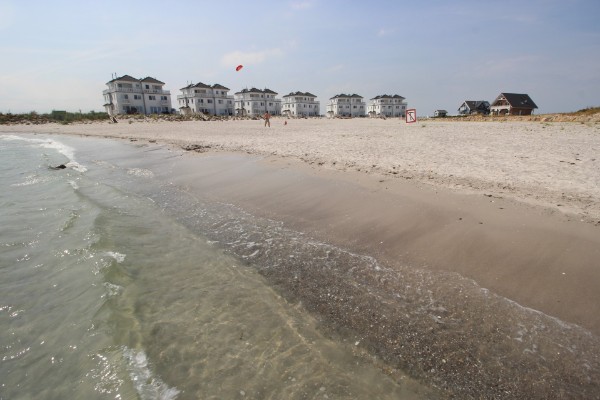 Ostseestrand am Strandhaus Libelle, geschützt durch die Molen des Hafens.